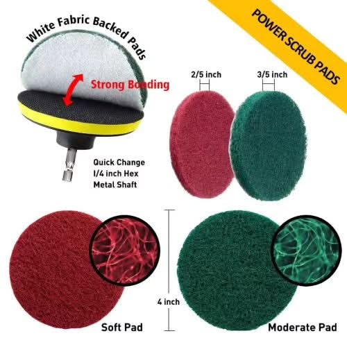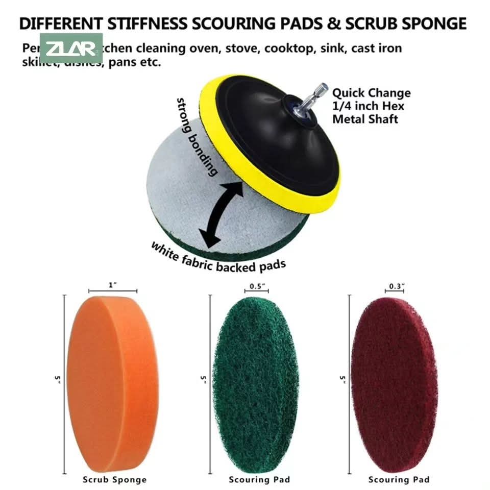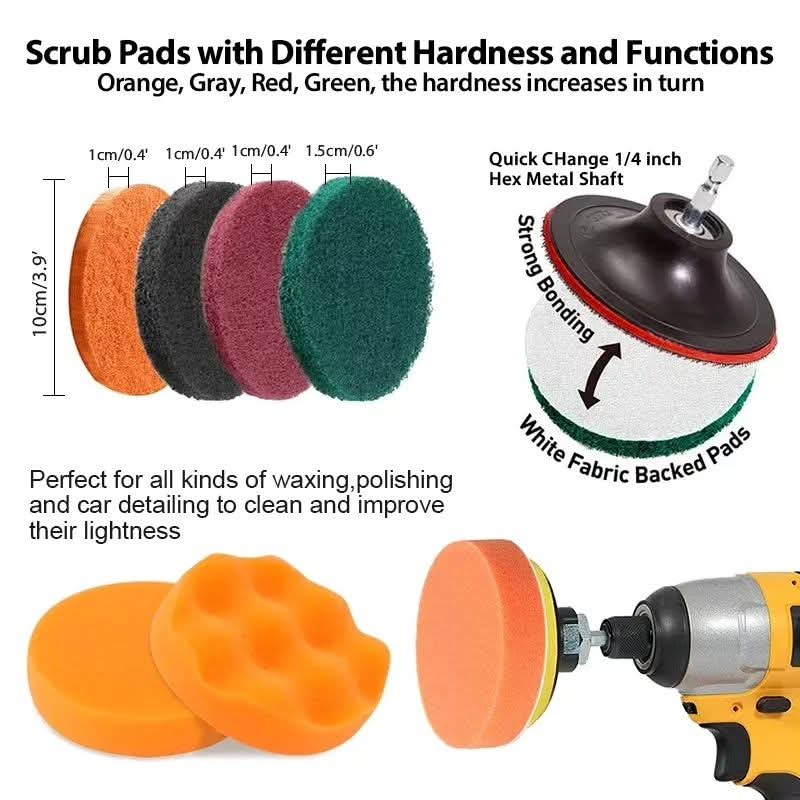 Komplet sadrži: četiri četke različitih promera ( 5, 8.8, 10, 12.7mm), šest diskova za čišćenje (10cm), dva diska za poliranje (10cm) i jedan adapter za bušilicu.