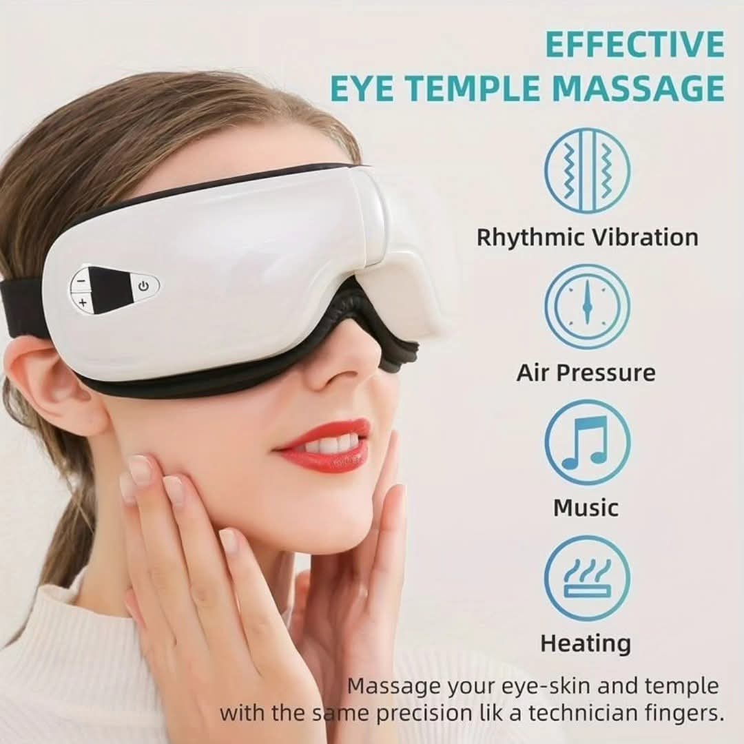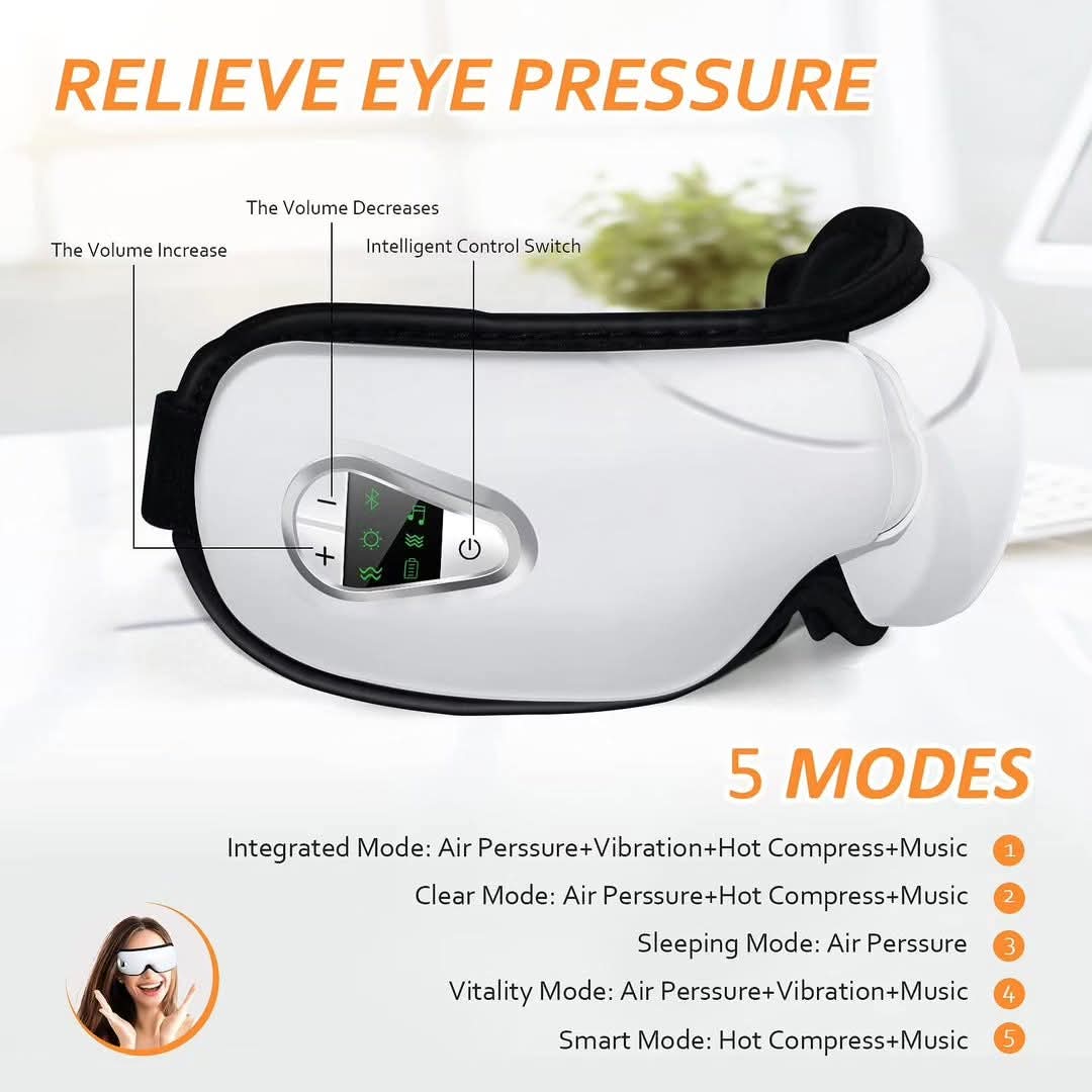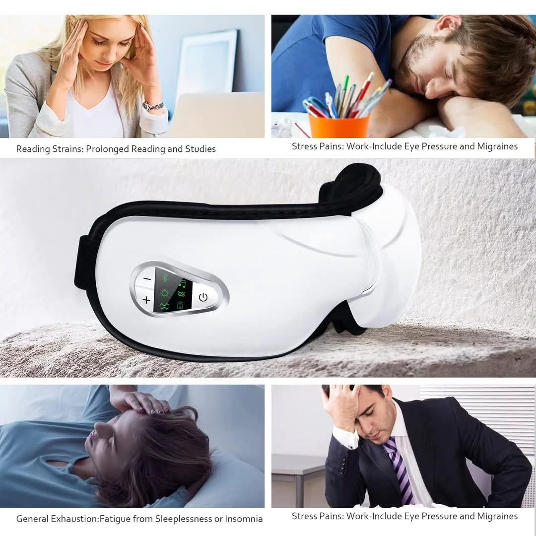 Masažer za oči ima okidačku tačku, vibracijski pritisak i ritmičku masažu udaraljkama, vrući kompres na konstantnoj temperaturi od 100 do 109 Farenhajta (38℃-43℃), potstiče cirkulaciju krvi u očima, eliminiše tamne krugove, uljepšava oči, bolje ublažava umor očiju, suve oči, potpuno opusta