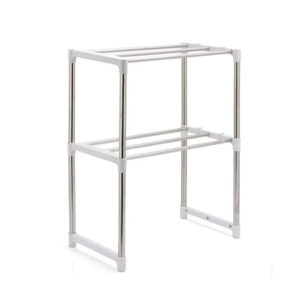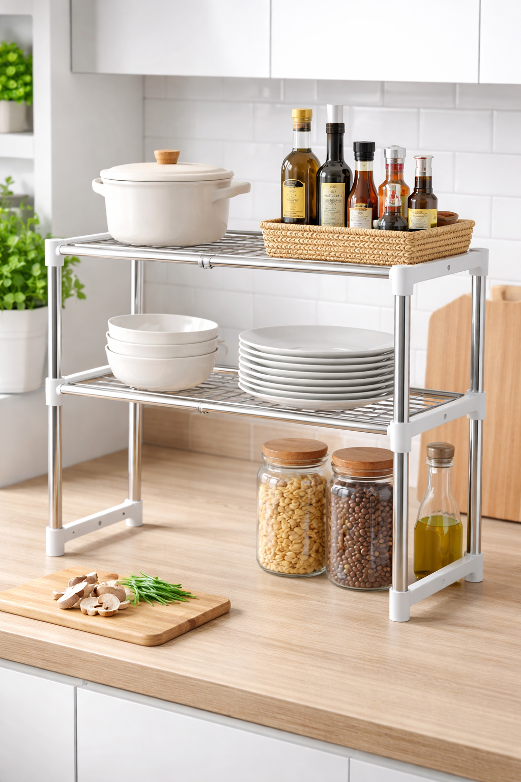 Polica je stabilna, otporna na vlagu i jednostavna za održavanje. Dvije razine omogućavaju maksimalno iskorištavanje prostora na radnoj ploči, dok otvorena konstrukcija osigurava lak pristup i dobru preglednost stvari. Pogodna za kuhinju, ostavu ili čak kupaonicu.