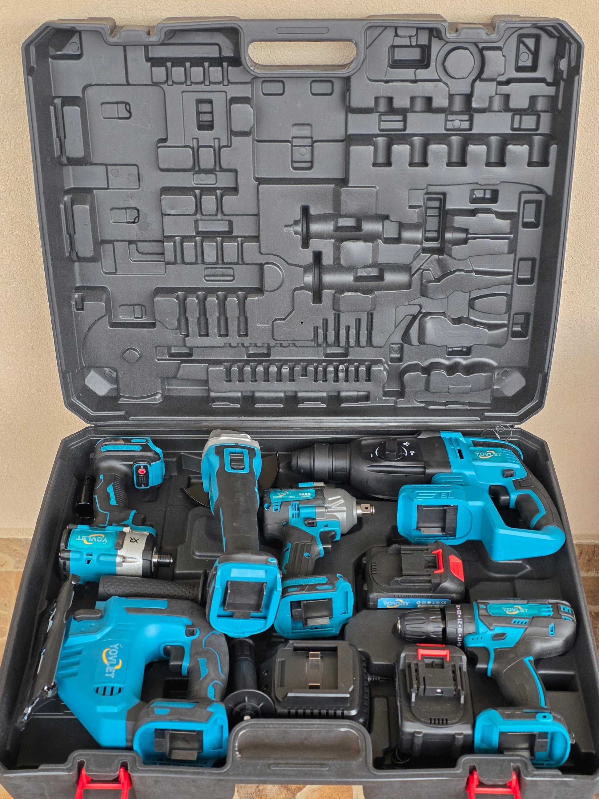 Profesionalni Aku set 6u1 sa dvije litijumske baterije 198V (6.0 Ah): udarni odvijač, brusilica, šrafilica, bušilica sa čekićem (hilti), aku testera i aku dovijac za matice