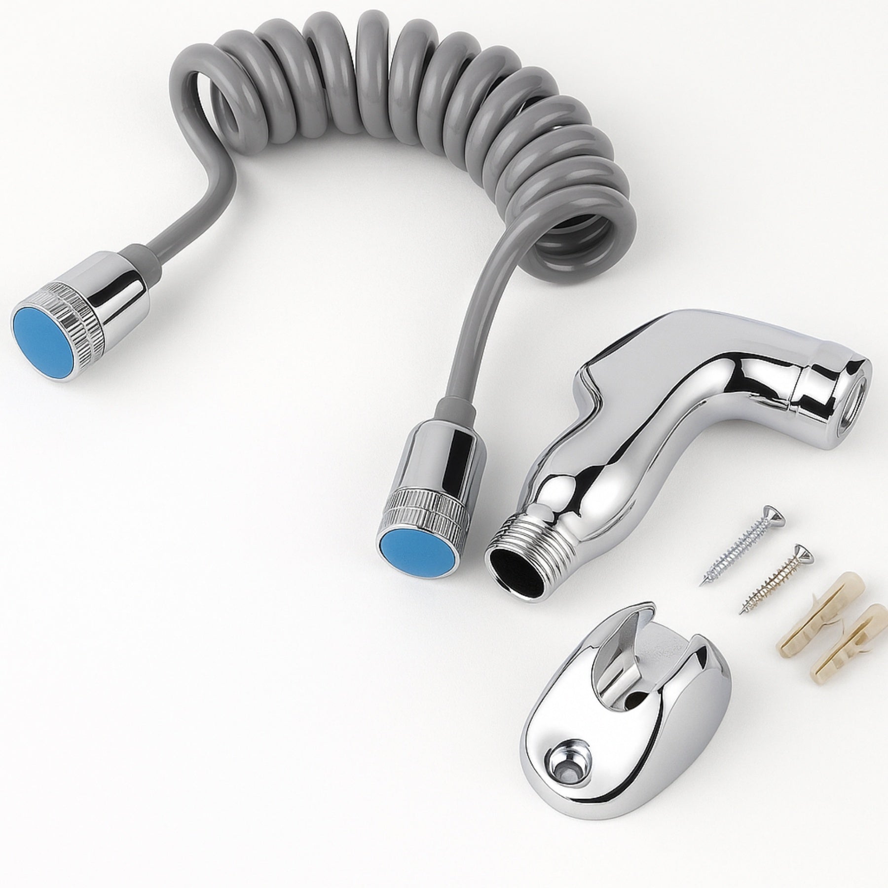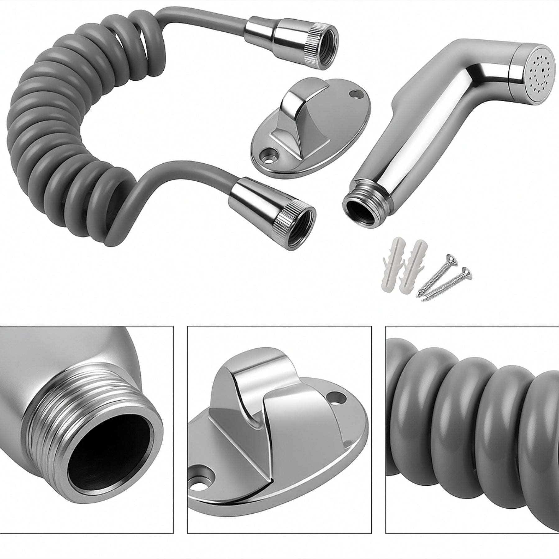 Praktičan i moderan ručni tuš idealan za upotrebu u kupatilu – kao dodatak bideu, wc šolji ili za ličnu higijenu. Set sadrži hromirani tuš pištolj, spiralno fleksibilno crijevo koje štedi prostor, nosač za montažu na zid i potreban montažni pribor (tiplove i šrafove).