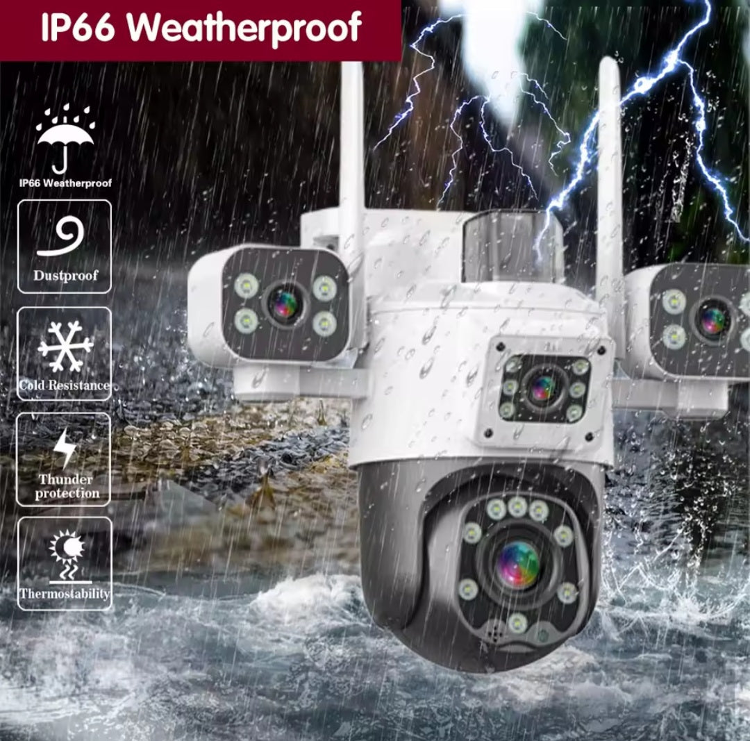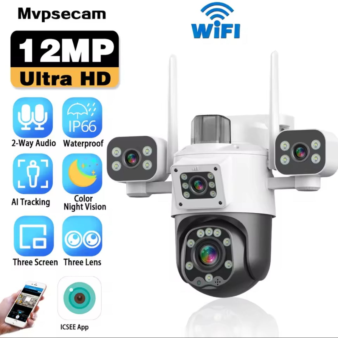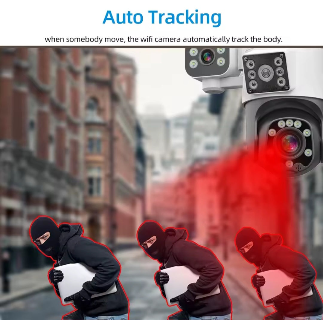Ova 12MP WiFi PTZ sigurnosna kamera pruža vrhunski nivo zaštite zahvaljujući tri sočiva, pametnom praćenju i izuzetno jasnoj slici – danju i noću. Dizajnirana je za spoljašnju upotrebu i pouzdan rad u svim vremenskim uslovima.
