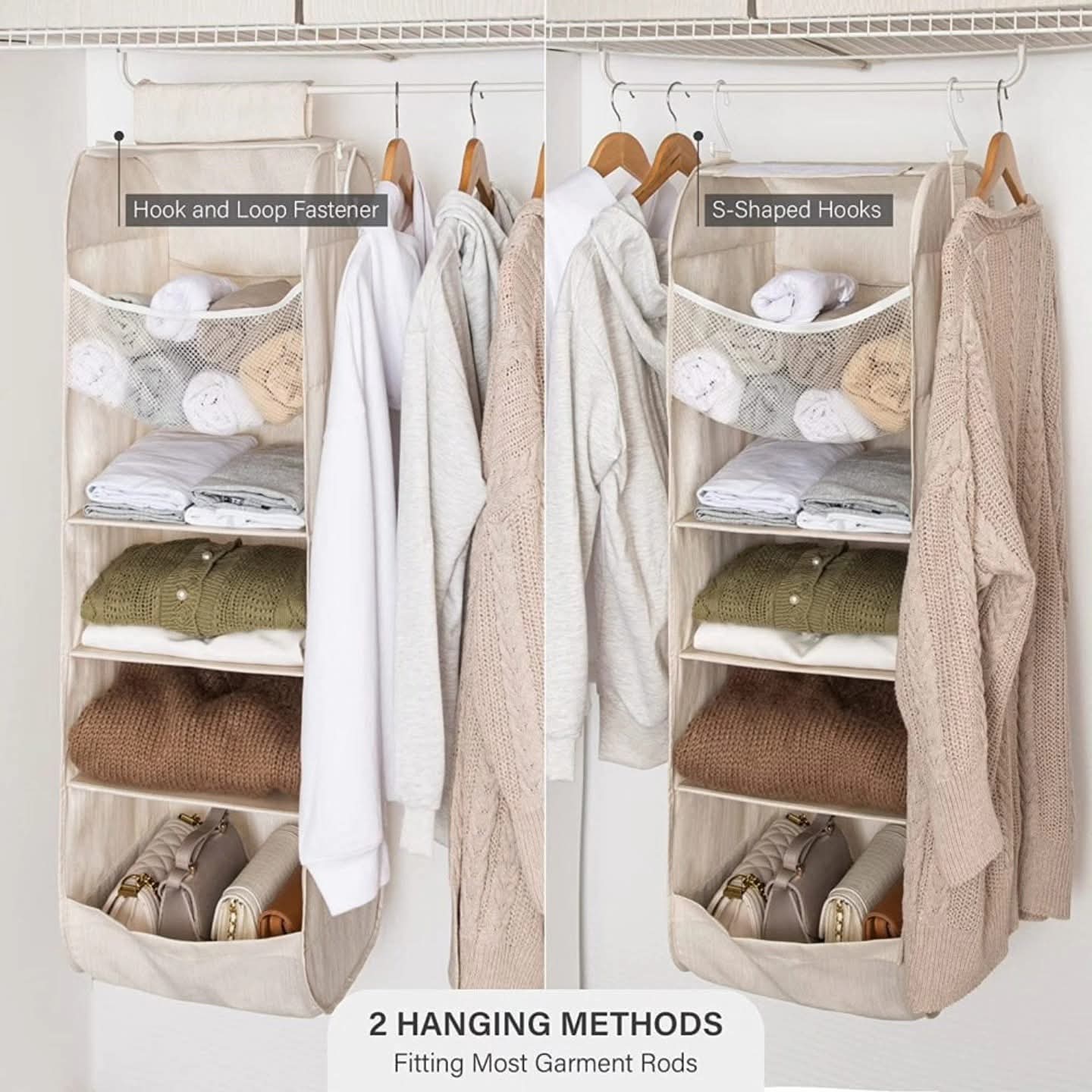 Dvostruki sistemi za vješanje: Naš organizator visećih ormara može se montirati pomoću kuka i čičak trake stvarajući savršenu i dugotrajnu ravnotežu, a mrežaste trake na vrhu osiguravaju sigurnost tako da izgubljeni predmeti ne ispadaju